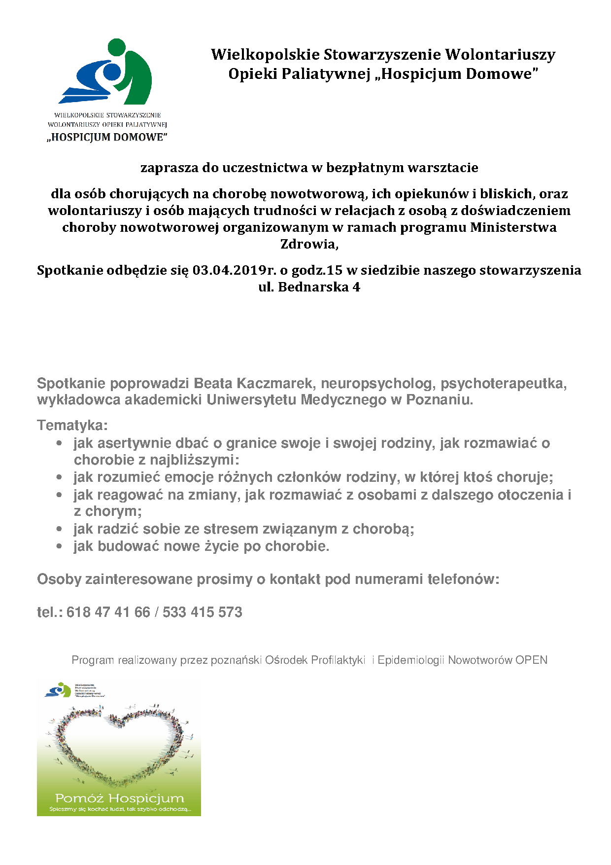 Zaproszenie na warsztat Napisane przez hospicjum dnia 01-04-19. Wysłane Blog Zapraszamy do uczestnictwa w bezpłatnym warsztacie dla osób chorujących na chorobę nowotworową, ich opiekunów oraz wolontariuszy. Następny artykuł